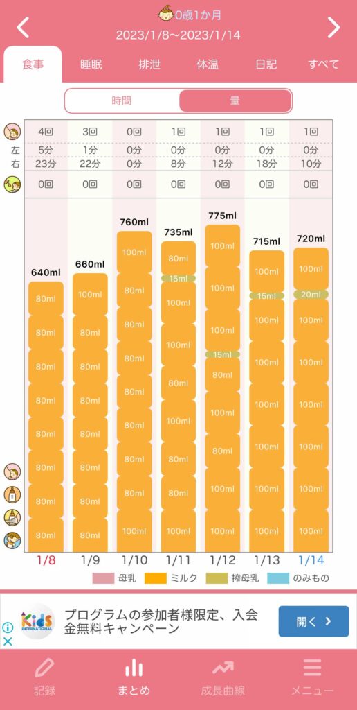 特に助かるのは、睡眠時間のまとめの1時間ごとの点線や、1週間の授乳量や睡眠時間を日毎グラフ化してくれるため、比較しやすいです。