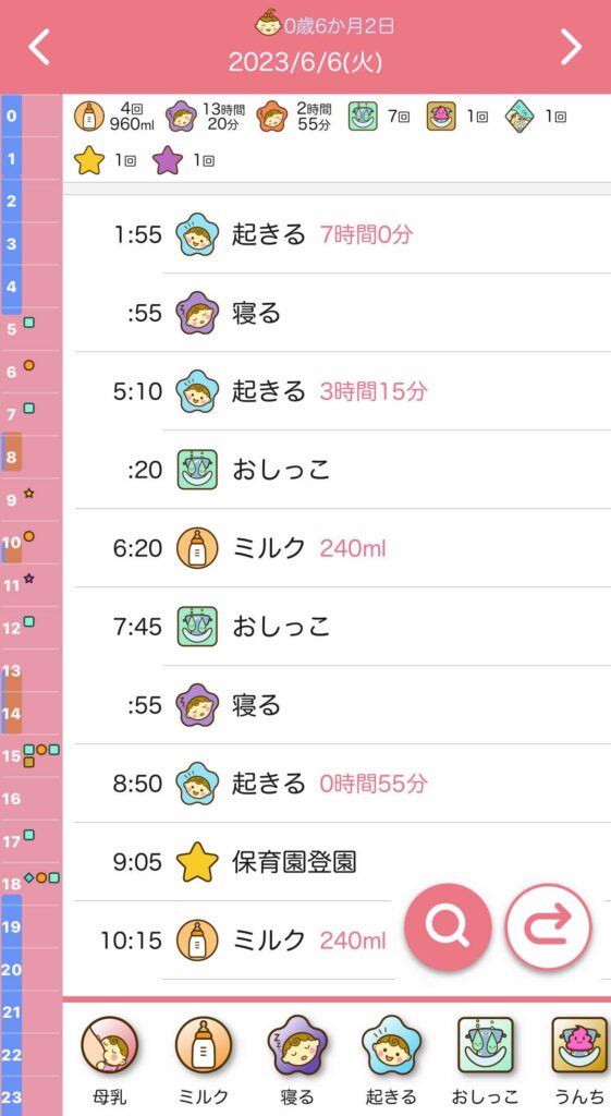 うちの子はだいたい睡眠時間が13時間くらいなので、今日はあと何時間寝かせる必要があるといった予測計算がしやすいです。