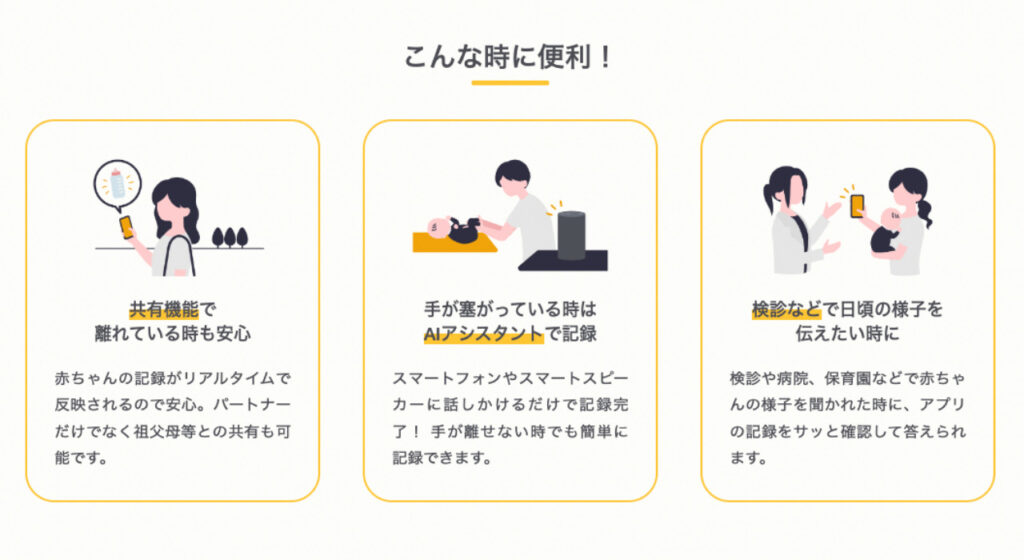 夫婦で子育ての記録や情報を共有できるし、2人目が生まれてからますます手放せないアプリになりました。